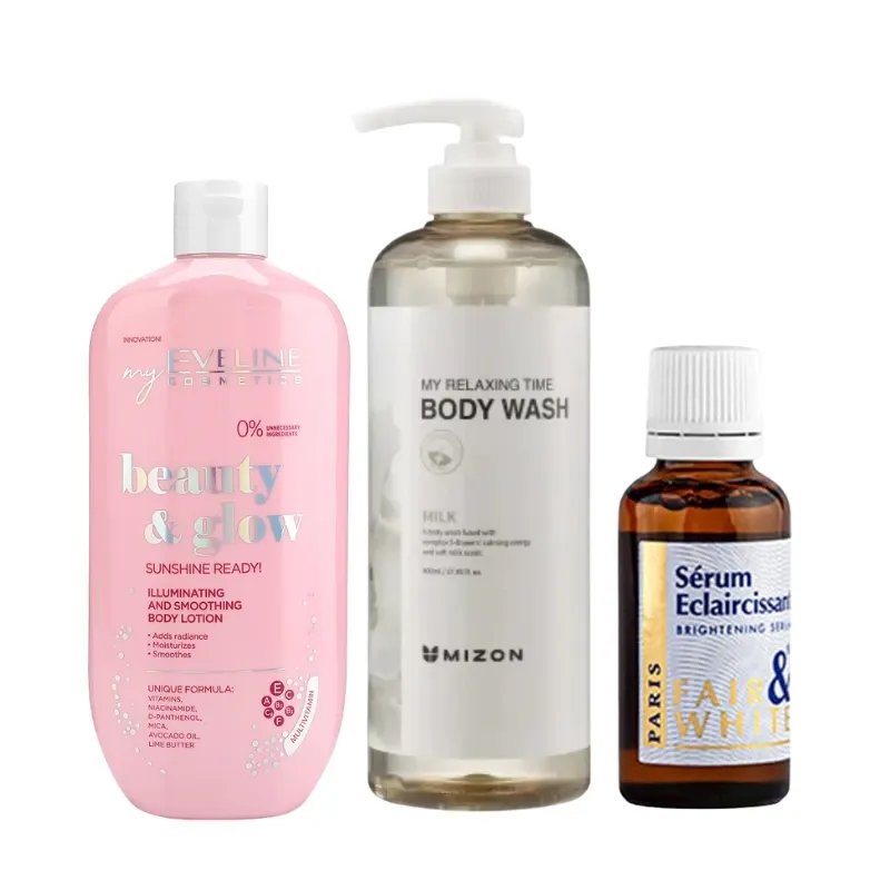 روتين متكامل لتقشير البشرة، توحيد لونها، وترطيبها، يجمع بين سيروم فعال، جل استحمام مغذي، ومرطب غني بالمكونات الطبيعية.