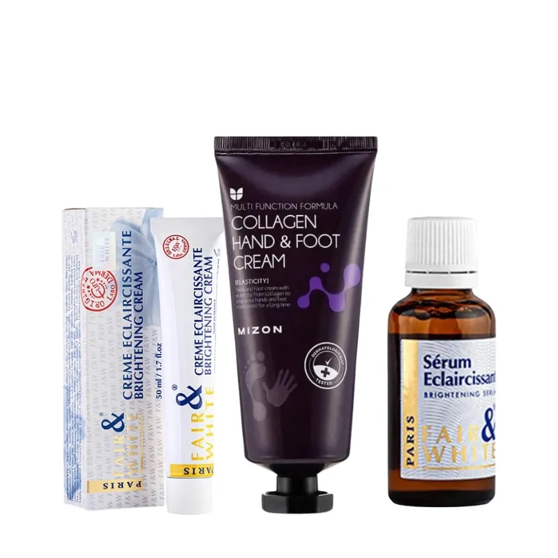 روتين متكامل لتفتيح البشرة وتوحيد لونها، يجمع بين سيروم مركز، كريم تفتيح، وعناية مغذية لليدين والقدمين.