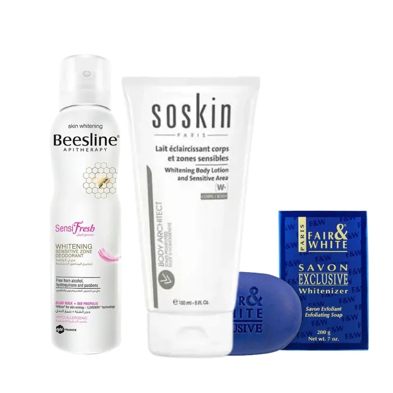 A complete set for brightening the body and intimate areas, combining a lightening lotion, exfoliating soap, and deodorant for sensitive zones.