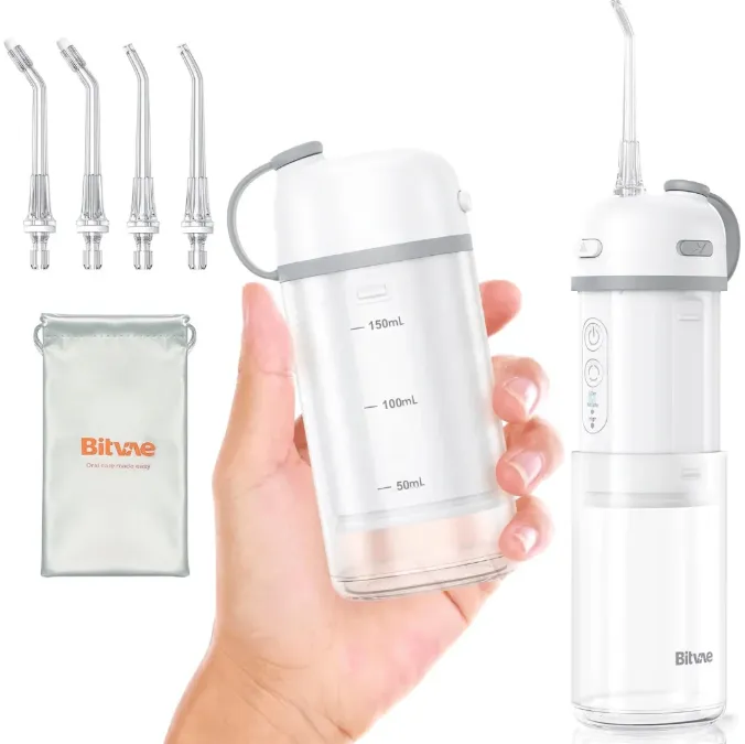 A compact and travel-friendly water dental flosser that combines powerful performance with easy portability. It features a collapsible water tank to save space, along with a waterproof bag and a dedicated compartment for storing tips, making it a practical choice for oral care on the go or for daily use.